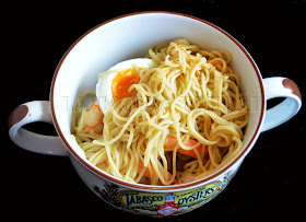 Agregamos la parte verde de cebolleta cortada muy fina, medio huevo duro con la yema bastante fluida, encima colocamos los fideos ramen cocidos en el caldo hecho con cabezas de langostino, acabamos llenando el recipiente con el caldo principal procurando que caigan tropezones de setas, champiñones y espinacas.